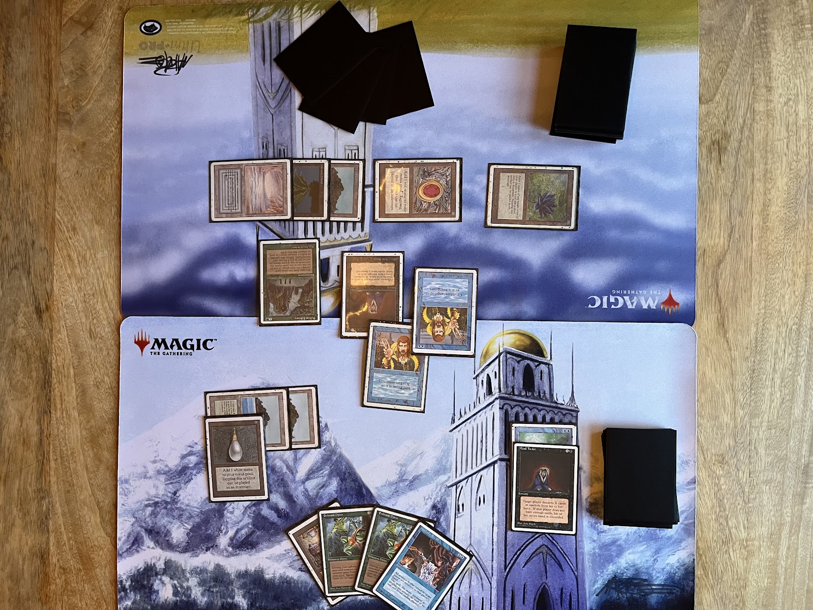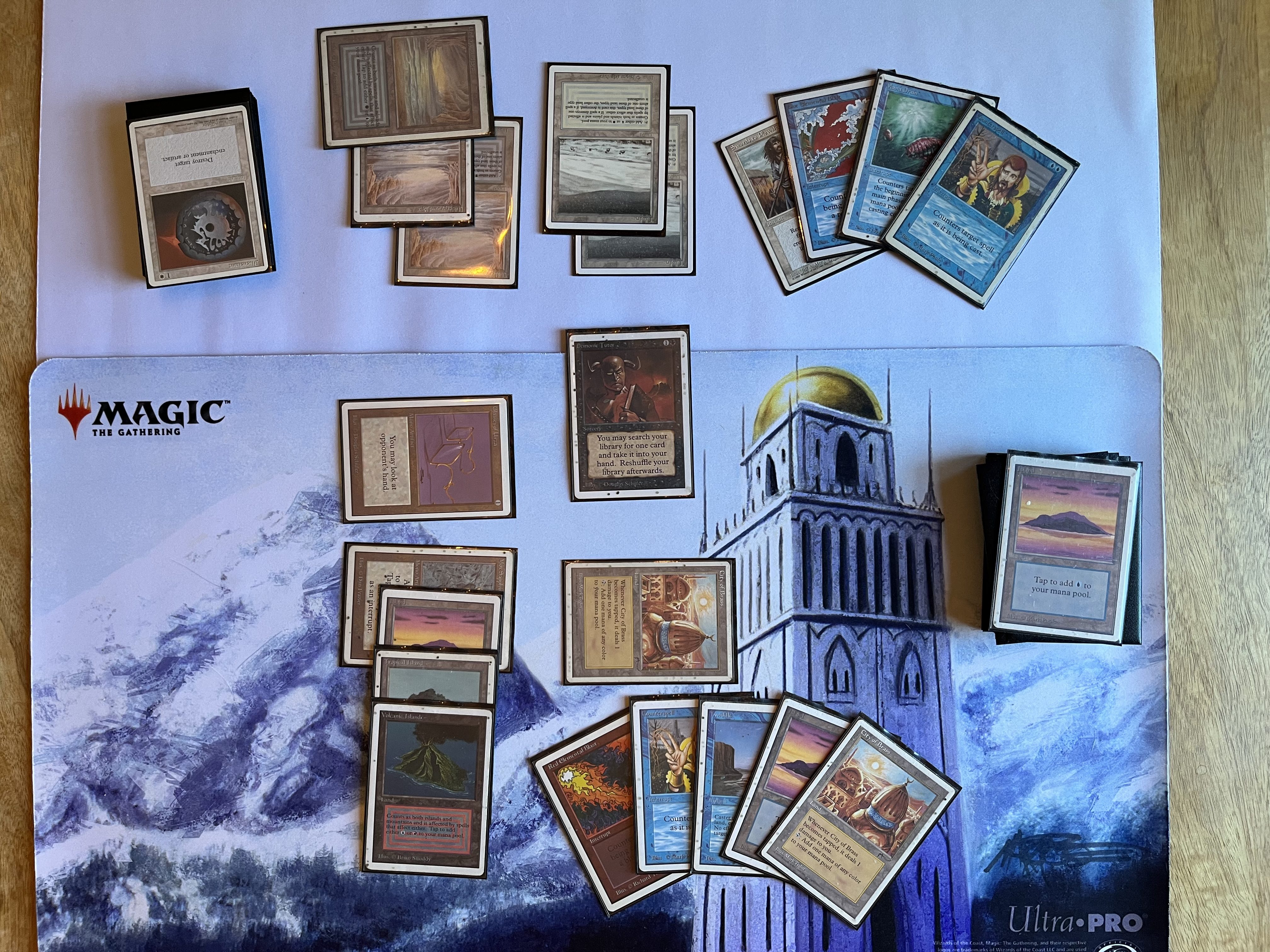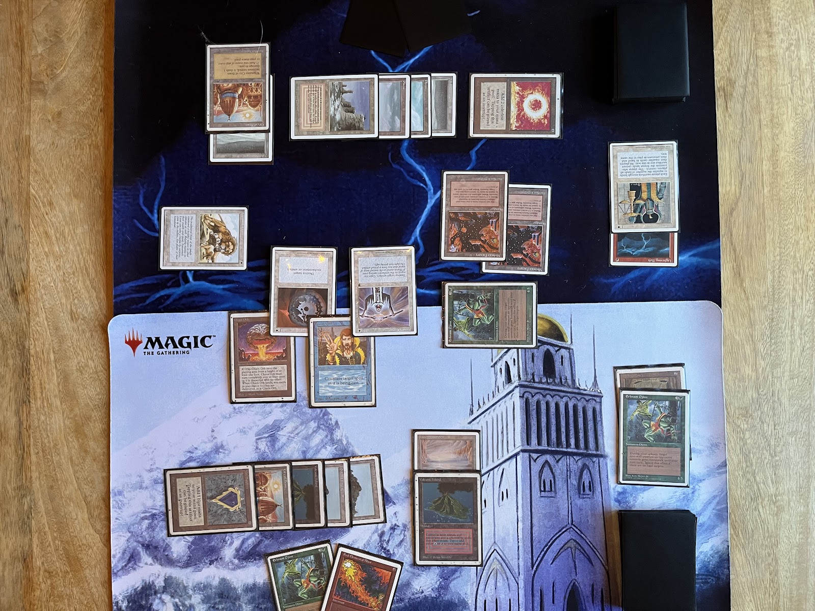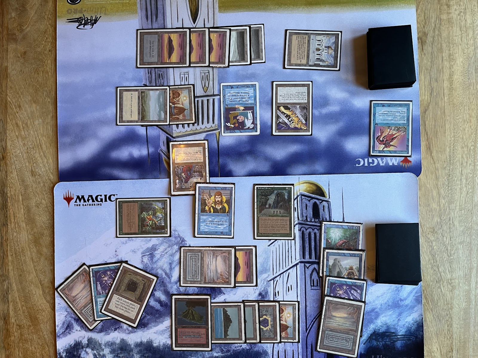 I go off a bit but not fully. I’m at 8 but have an erhnam and a full grip. He’s at 16. I can’t take another turn but I do mind twist his hand before passing. He draws 5 cards from my 4 mines. I have one counter. He plays a dude. It resolves. He plays blood moon. Interesting. I have islands in hand, so I could be okay. I decide to counter it because I couldn’t counter his next spell anyway under blood moon. His third spell he casts is… timetwister. Let’s do this. He has 1C left after this. Timetwister doesn’t give him what he needs but favors me, in addition to my 4 howling mines in play. That’s what happens sometimes. Game 2 he starts with a fast suchi and trike. I have erhnam but he double bolts it. I’m facing lethal so I have to go off. I time walk twice then wheel. Then I time walk again and wheel again. But then even with drawing 8 more cards my next turn I don’t get what I need and die to robot beats. Game 3 he starts with lotus, pass. I play T1 library, lotus, pass. He plays workshop, suchi. I play ernie. He plays a second suchi, attacks, and bolts my ernie dead. He shatters my sapphire, my only artifact. I have transmute in hand but can’t use it without an artifact. I opt to hurkyl’s recall myself, saving my sapphire. I feel pressure to go off when he’s tapped out, but hold off one more turn. I play mine, keep up a counter, and pass. He attacks me to 4. I opt to go off library to play a mana to be able to counterspell. I play transmute for time vault. He does have the REB. I counter that, twiddle into another twiddle and win from there. Whew.