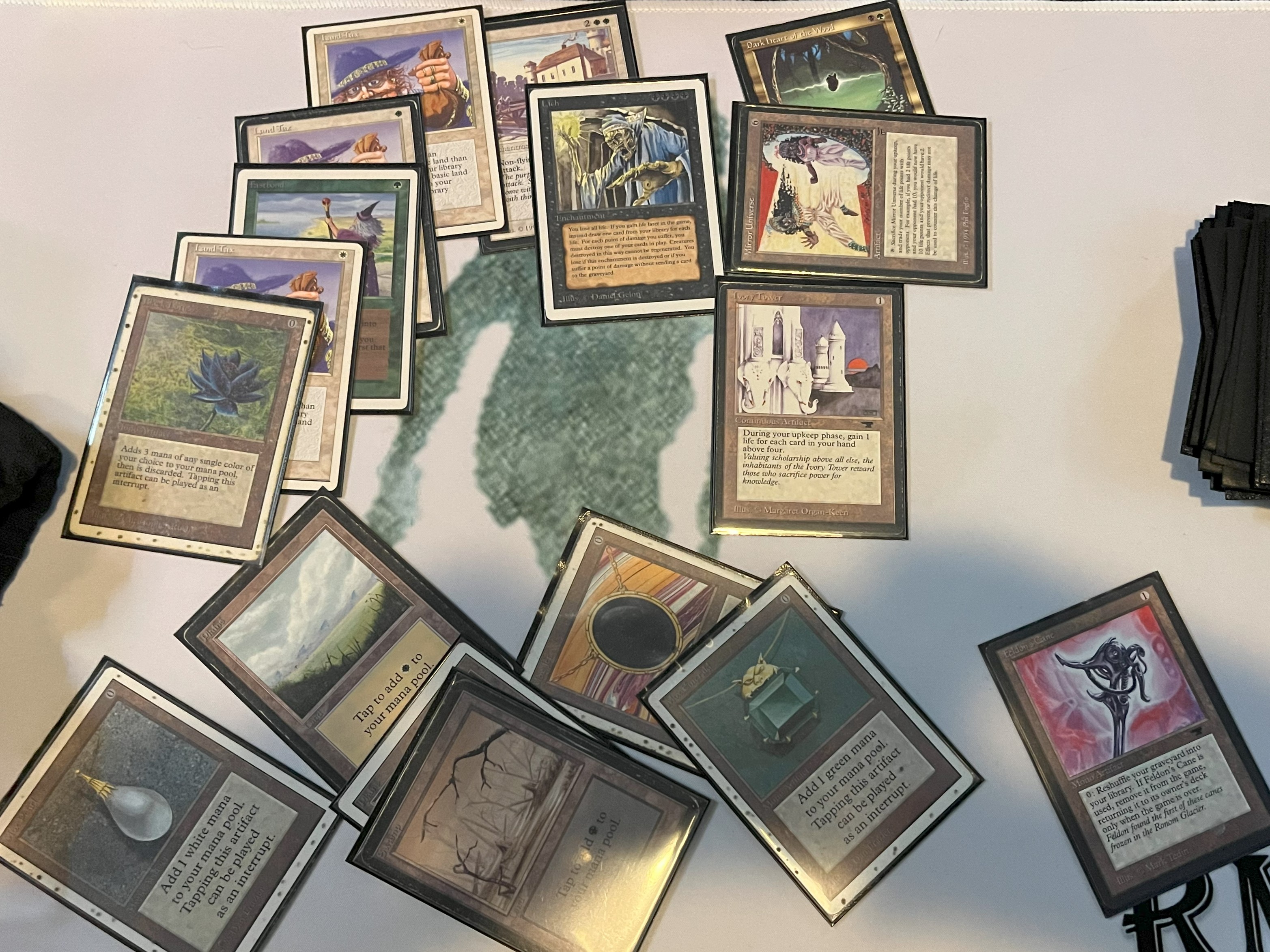 Justin was also on a sweet Land Tax deck, and the Land Tax mirror is not a fun one. He starts with mox pearl into land tax, and I struggle with what to do. I play into it, thinking I have the faster combo with Lich. Maybe I should have played draw go for a zillion turns to craft the perfect hand, but one doesn’t play Lich combo and try to eeek out every ounce of value. He hits me for some life, plays land’s edge, and gets me down to 10. I don’t draw my life gain which would have been clutch here. I draw some extras with Sylvan to dig deeper, going down to 2 against his empty hand, but don’t draw any. He topdecks a Library of Alexandria and pitches it to Land’s Edge to finish me off. What a way to win in style with Library. Game 2 I get to do my thing and Justin has a good laugh. I get to check my bucket list for the event by using Ivory Tower to draw cards with Lich. I draw 5 cards and do busted things.