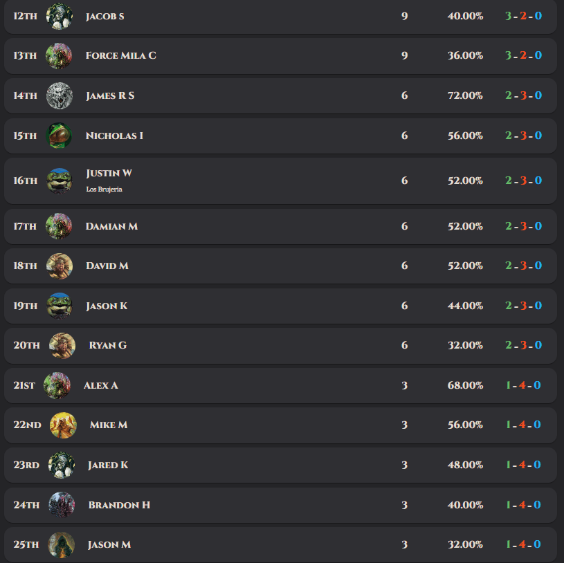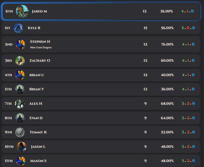 Final Standings & Top 4 Decks – Note: Jacob S from the Desert Twisterโs record should have been higher and in the top 8 for sorcery. Looks like we fat fingered a loss instead of a win during the first round.
