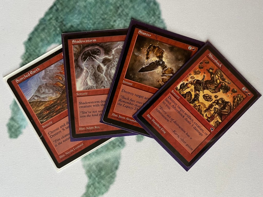 One specific change that stood out was replacing Shadowstorm with Aftershock. I wanted red to have access to artifact destruction and land destruction in a more flexible way. Scorched Earth could be decent. Stone Rain was useful but narrow, and Shatter/Shattering Pulse didn’t quite do enough on its own. Aftershock could hit creatures, artifacts, or lands, which made it much more versatile, and it was also a card that I had played a lot when I was younger but had initially overlooked.