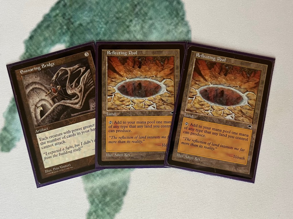 I also removed cards that didn’t contribute to the overall experience, such as Ensnaring Bridge, which tended to stall games without adding meaningful interaction, and made small adjustments to other parts of the cube, like adding a second Reflecting Pool to improve mana flexibility. This was kind of a hard cut, but I always loved Reflecting Pool as a kid, and it’s just upside as a land. In general, cubes usually want to add more lands and fewer spells up to around 20-30% lands since players won’t play more than about 23 spells out of their 45 draft picks. This block is even lighter on lands than most, so I removed a cool artifact for an also cool land. Also, having 2 meant that you could use them both with Shard Phoenix to get the requisite RRR if that situation ever came up. Reflecting Pool also makes the duals in the block better, since it either doesn’t ping you like the painlands or untaps fine unlike the slow lands.