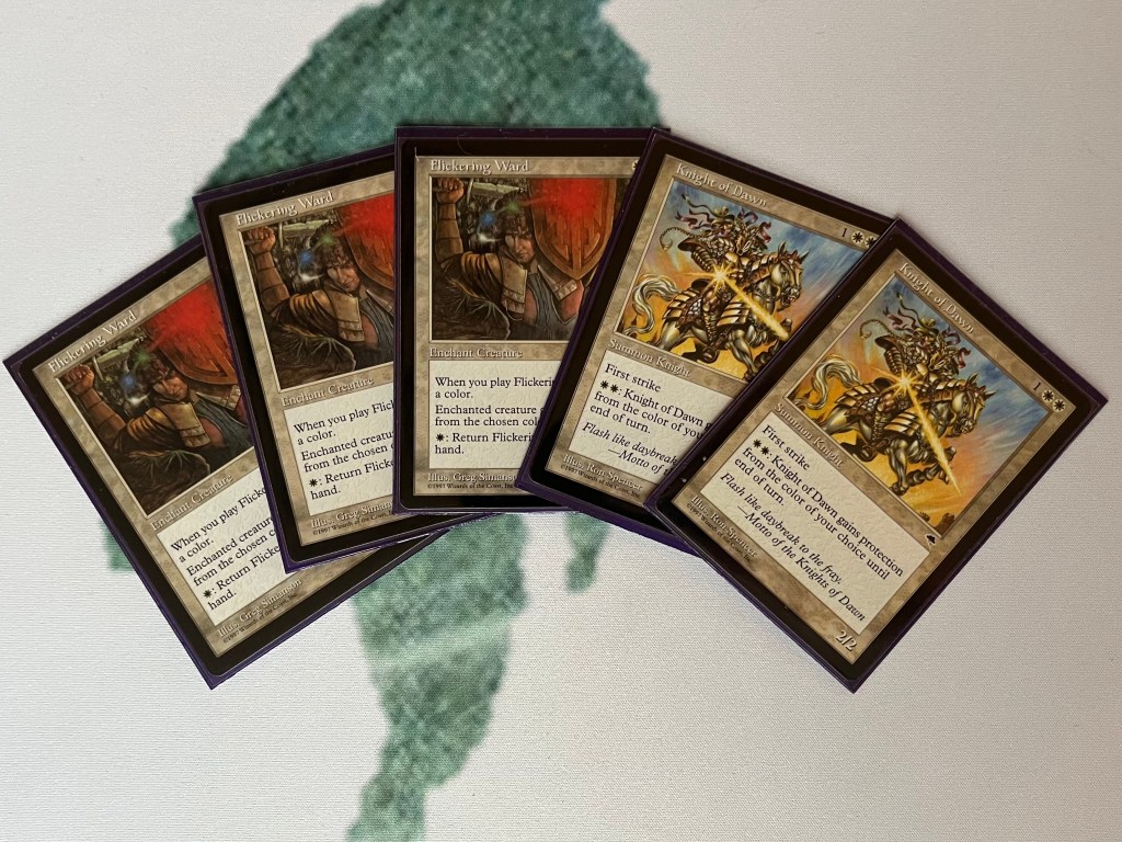 I also wanted something extra for White if I could. What I found eventually was the powerful protection mechanic. It was already one of White’s strengths in Tempest with Soltari Monk and Soltari Priest. It could become a big problem to deal with potentially, but often led to interesting plays when you could stop it. It also powered up the en-kor 6-card cycle a lot, so I added the powerful common Flickering Ward and the uncommon Knight of Dawn to help here.